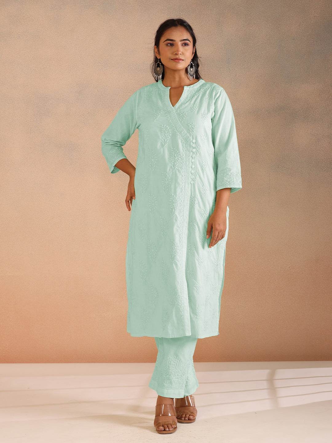 The MEHEK Cambric Chikankari Angarkha Co-ord Set is a breath of freshness — crisp, composed, and delicately detailed. Tailored in airy cotton cambric, it features hand-embroidered gala-bootie work with scattered paisleys that add quiet rhythm across the surface. The mandarin collar and straight silhouette lend it a modern, polished edge — perfect for days when comfort deserves intention.