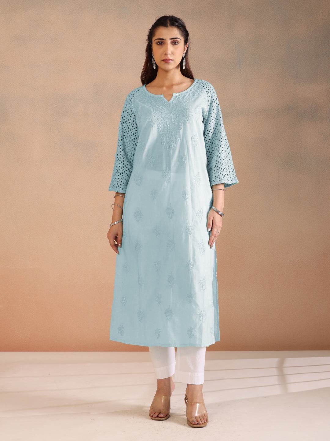 The MINAAR Cotton Chikankari Kurta draws from the graceful intricacy of old minarets — structured yet delicate, ornate yet wearable. Its Raglan bell sleevless elevate the breeziness of this stylish kurta.