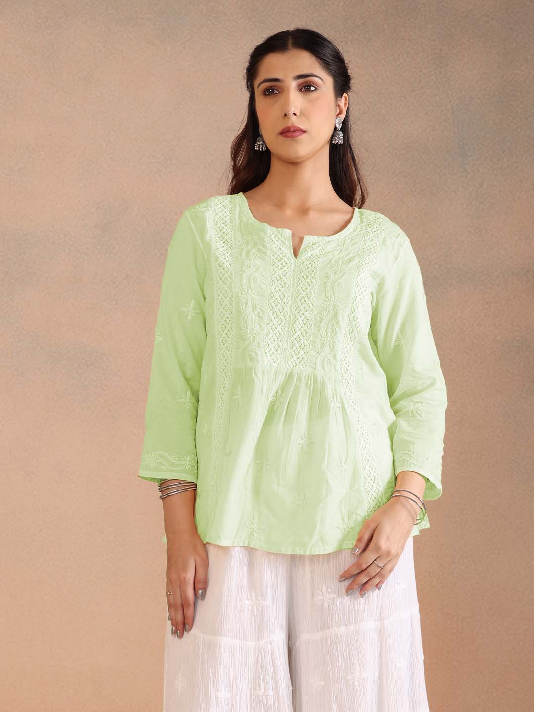 Effortless and calming, the SAHRA Mulmul Lace Yoke Chikankari Top is designed for those who love comfort without compromising on craft. Made in breathable cotton mul and hand-embroidered by skilled artisans in Lucknow, it features heritage stitches like Ghaaspatti, Phanda, and Bakhia, reimagined for easy everyday wear. No two pieces are ever identical — each one is a quiet reflection of handwork, making your garment truly one-of-a-kind.