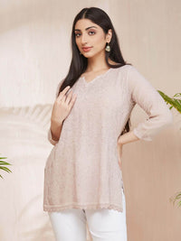 Introducing our ALISHA Chikankari Viscose Georgette Almond Straight Top, where 'ALISHA' embodies elegance. Crafted from airy Georgette fabric with intricate chikankari and shimmering mukaish work, this top exudes timeless sophistication. Its straight silhouette offers versatility, perfect for elevating your style with understated charm. A must-have addition to your wardrobe, it effortlessly transitions from day to night, ensuring you shine with refined grace.
