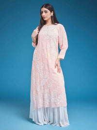 Embrace timeless sophistication with our ASMA Chikankari V. Georgette Cuff Pleat Kurta in Peach, Named after the Arabic word for 'Sky' or 'Heaven,' ASMA captures the ethereal essence of this piece. Crafted from luxurious Georgette fabric and adorned with intricate chikankari detailing, this kurta exudes effortless elegance. The new cuff pleats add a modern touch, making it perfect for any occasion where style and grace are essential, ensuring you stand out with celestial charm.