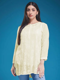 Indulge in the floral charm of our GUL Chikankari V. Georgette Butter Yellow Flat Seam Top. Named for its scattered blooms, 'GUL' translates to 'Flower' in Urdu, infusing a delicate allure into your attire. Crafted from airy Georgette and adorned with intricate chikankari, this top exudes timeless grace. With its flat seam design, it offers both sophistication and comfort, making it a versatile addition to your wardrobe for any occasion.