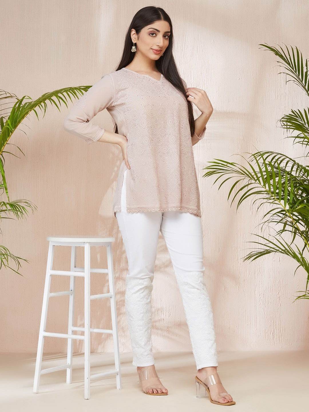 Introducing our AASHNA Chikankari Lycra Pant in Jaaldaar White, where 'AASHNA' reflects 'Friendship' in Hindi, embodying the versatile and companionable nature of this wardrobe staple. Crafted with intricate chikankari detailing on comfortable Lycra fabric, this pant offers both style and ease, making it an essential choice for any occasion, ensuring you exude charm and confidence effortlessly.