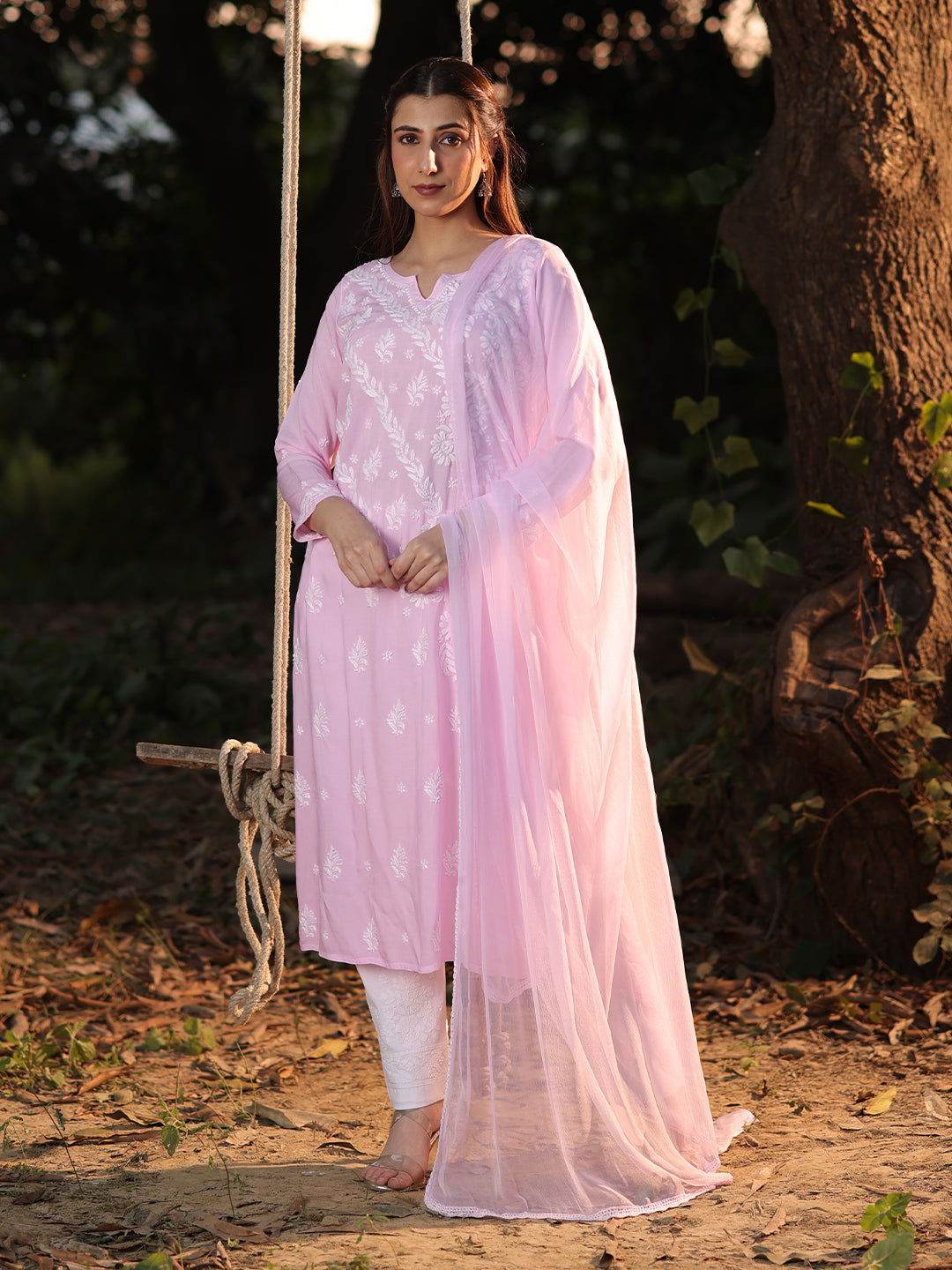 ERMINA Chikankari Modal Pink Kurta - Pink / XS