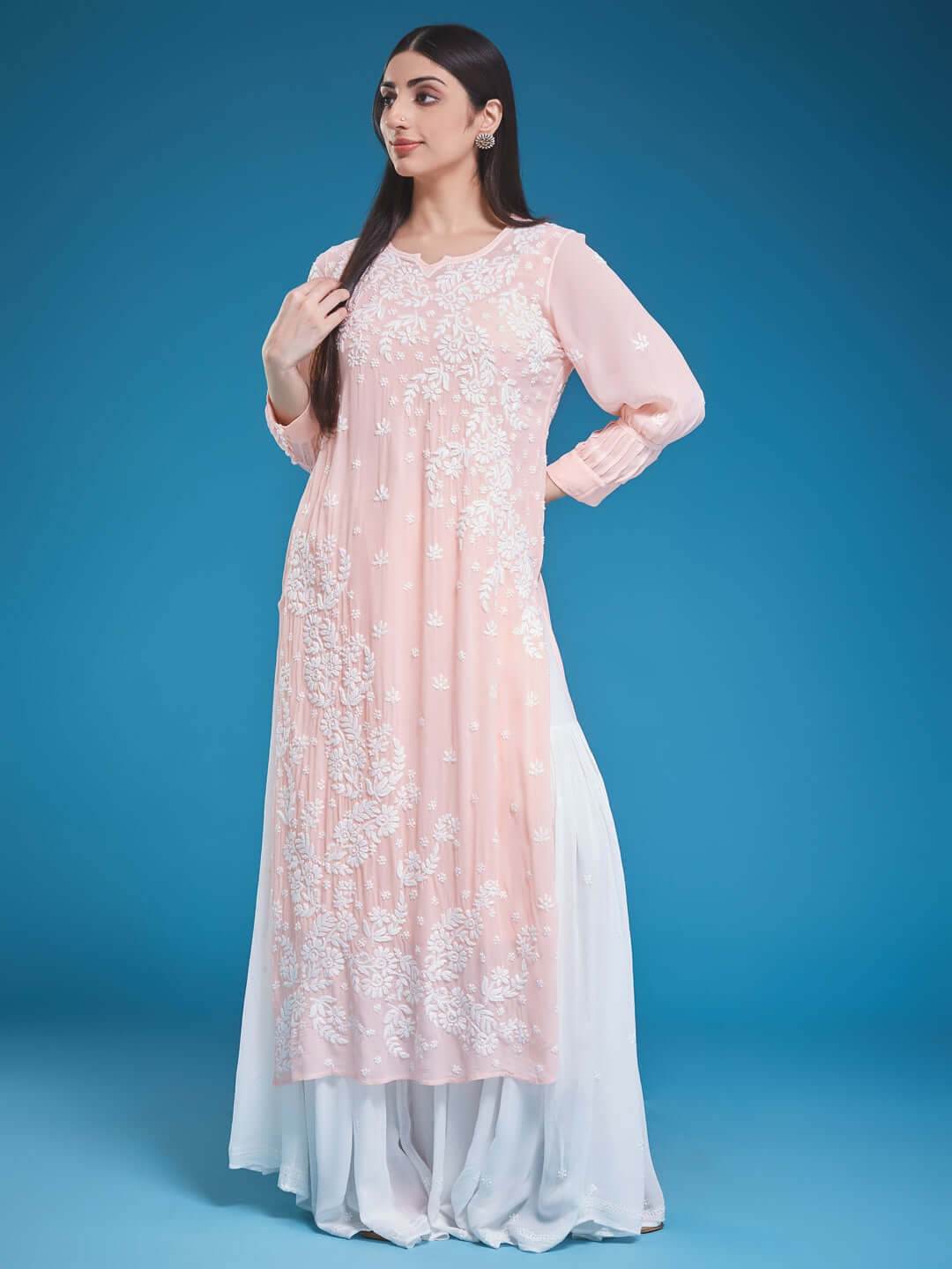 Step into elegance with our PANKHURI Chikankari V. Georgette Pleated 6 Kali Sharara in White. 'PANKHURI' translates to 'Petals' in Hindi, mirroring the delicate beauty of this article. Crafted with intricate chikankari embroidery on airy Georgette fabric, and featuring a pleated 6 kali design reminiscent of a flower with six petals, it offers timeless elegance for any occasion, ensuring you bloom with grace and style.