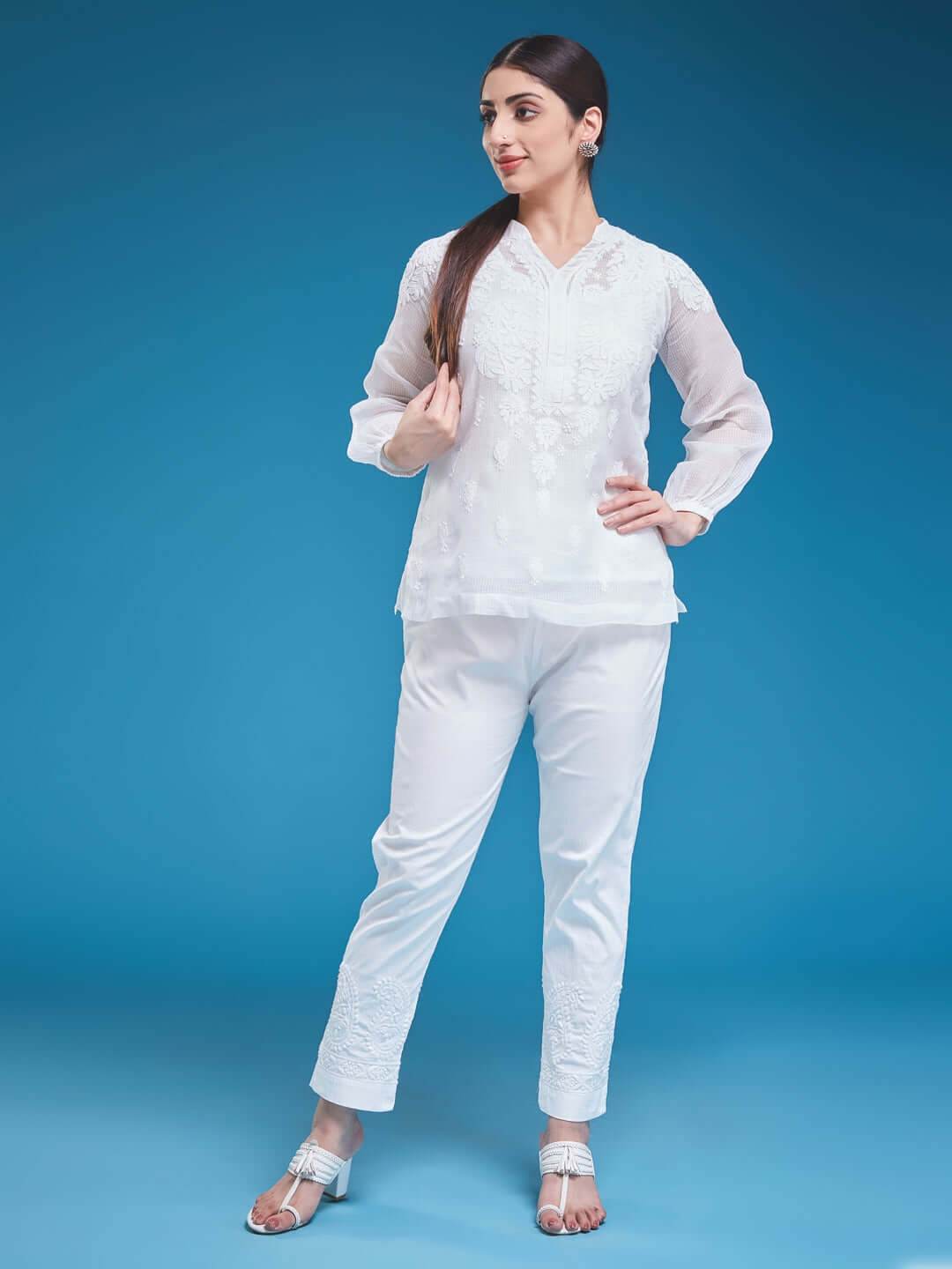 Meet our ROZINA Chikankari Lycra Pant in White. With 'ROZINA' echoing 'Delightful' in Persian, this pant promises both comfort and charm. Adorned with intricate chikankari, its half elastic waistband ensures a perfect fit, making it a delightful addition to your wardrobe for any occasion.