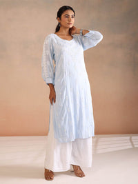 The RISAL Modal Chikankari Necklace Kurta feels like something meant to be lived in — familiar, refined, and deeply personal. Cut from soft viscose modal, it features hand-embroidered gala-bootie work with delicate floral details placed close to the heart. Shirt-style sleeves with cuffs and a flattering V-neckline lend it a tailored finish, while the straight silhouette keeps it effortlessly wearable.