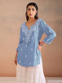 The TANAAZ Modal Chikankari Short Top feels as graceful as its name — soft on the skin, thoughtful in detail. Made from premium viscose modal, it glides with ease while offering a fluid drape. Hand-embroidered gala-bootie work in Ghaaspatti, Ulti Bakhia, and Phanda lends the piece a subtle charm, making it perfect for everyday dressing with a refined edge.