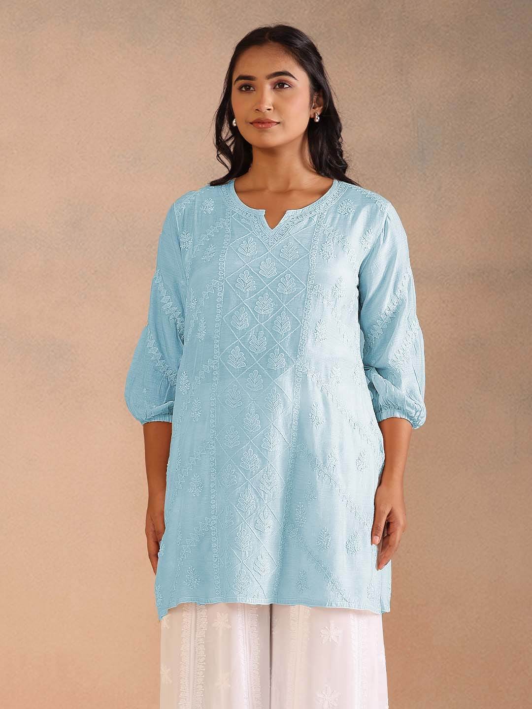 The ABIRA Muslin Chikankari Top flows like light on water — soft, luminous, and quietly refined. Crafted in featherweight viscose muslin, it’s designed for comfort with a sense of grace. The bishop sleeves and elongated silhouette add fluid movement, while delicately hand-embroidered panels lend it quiet intricacy rooted in tradition.