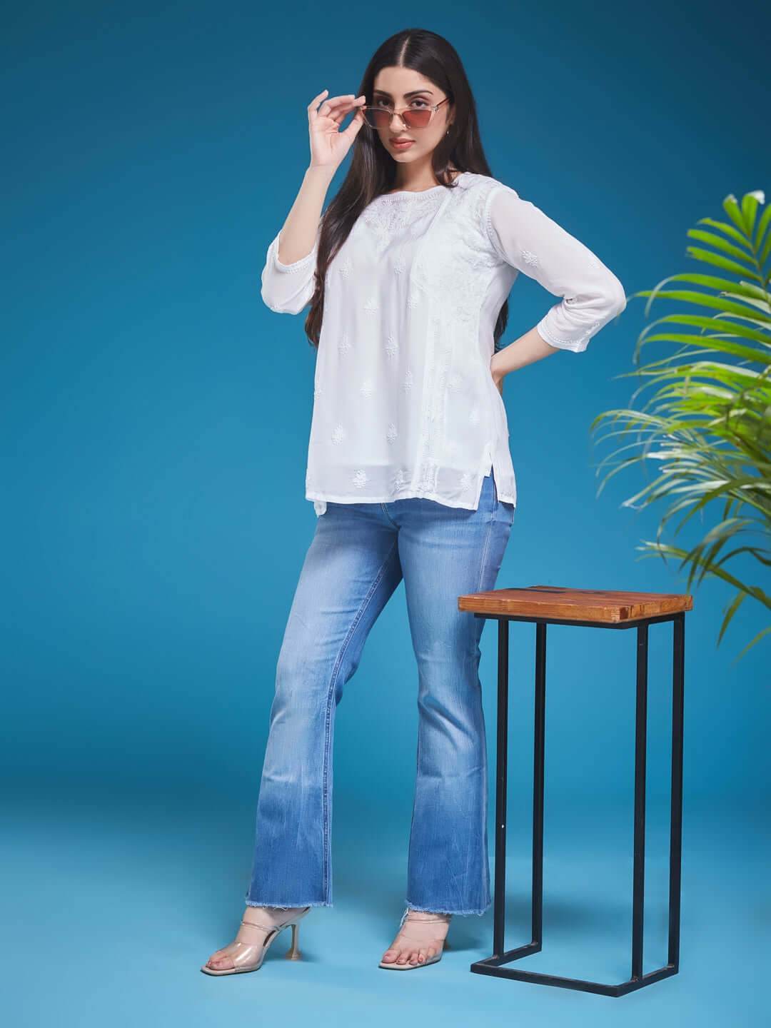 Discover our CHANDNI Chikankari Muslin Top in White, inspired by the captivating radiance of moonlight. Made from plush Muslin, embellished with intricate chikankari patterns, this top exudes a classic charm. The modern side panel design adds versatility and sophistication, making it the perfect addition to your wardrobe.