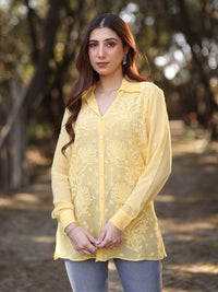 Crafted with utmost attention to detail, our Saniha Chikankari Premium Yellow Georgette Shirt combines traditional artistry with contemporary style. Elevate your wardrobe with this versatile piece that celebrates the rich heritage of Chikankari embroidery in a modern silhouette.