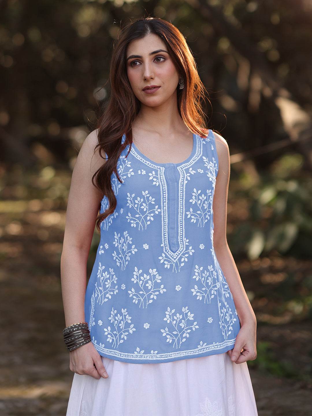 ZAYNA Chikankari Sky Blue Georgette Top - S / Sky Blue