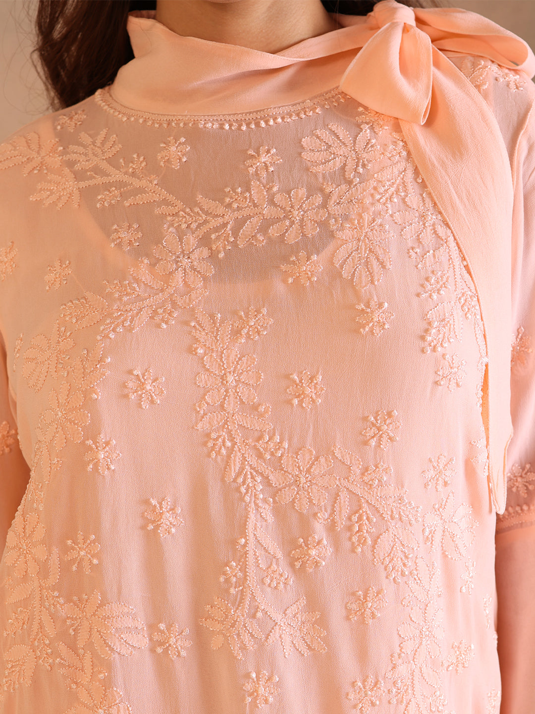 - Our lovely Peach ALYA GEORGETTE TOP features delicate hand-embroidery on fabric to keep you looking fashionable and comfortable.