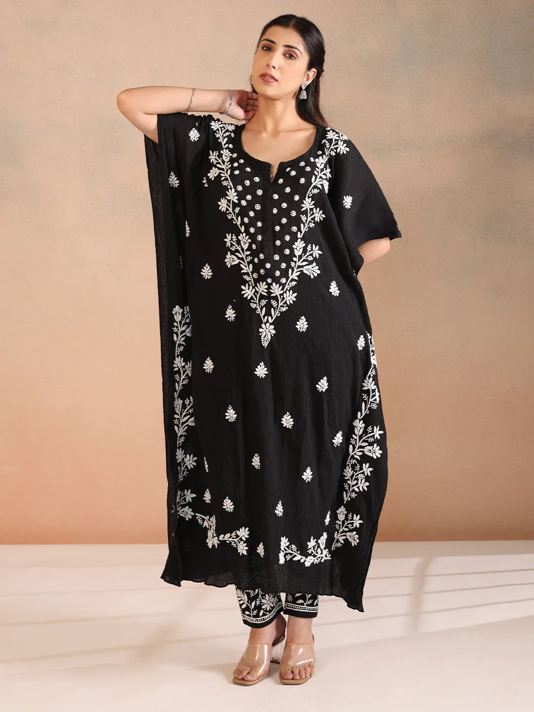 - Our lovely Black Faya Chikankari Crush Cotton Kaftan features delicate hand-embroidery on 100% Cotton fabric to keep you looking fashionable and comfortable.