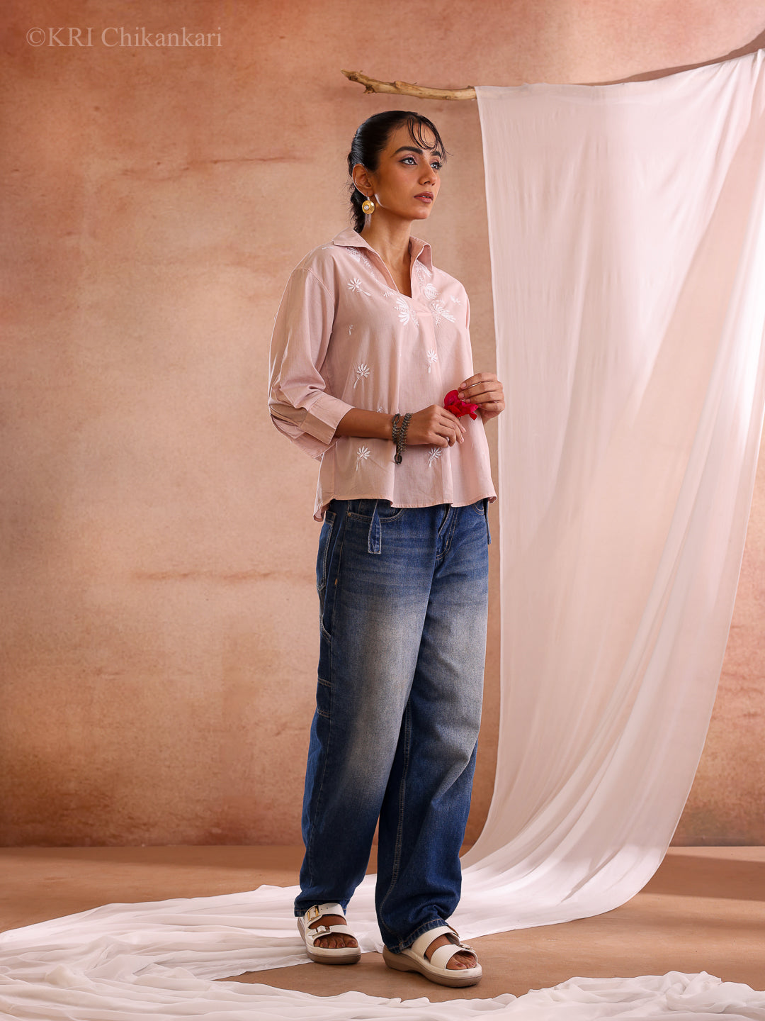 The Hiba Cotton Top draws inspiration from the gentle beauty of hibiscus flowers, reflected through delicate chikankari motifs that lend the garment a soft, floral charm. Handcrafted by skilled artisans in Lucknow, it brings together traditional embroidery with a relaxed, contemporary silhouette suited for everyday wear. The breathable cotton cambric keeps the piece light and comfortable, making it ideal for long days in warm weather. Effortlessly versatile, the Hiba top works beautifully for casual workdays, travel, or relaxed outings, offering a graceful blend of modern ease and the timeless artistry of Lucknowi craftsmanship.