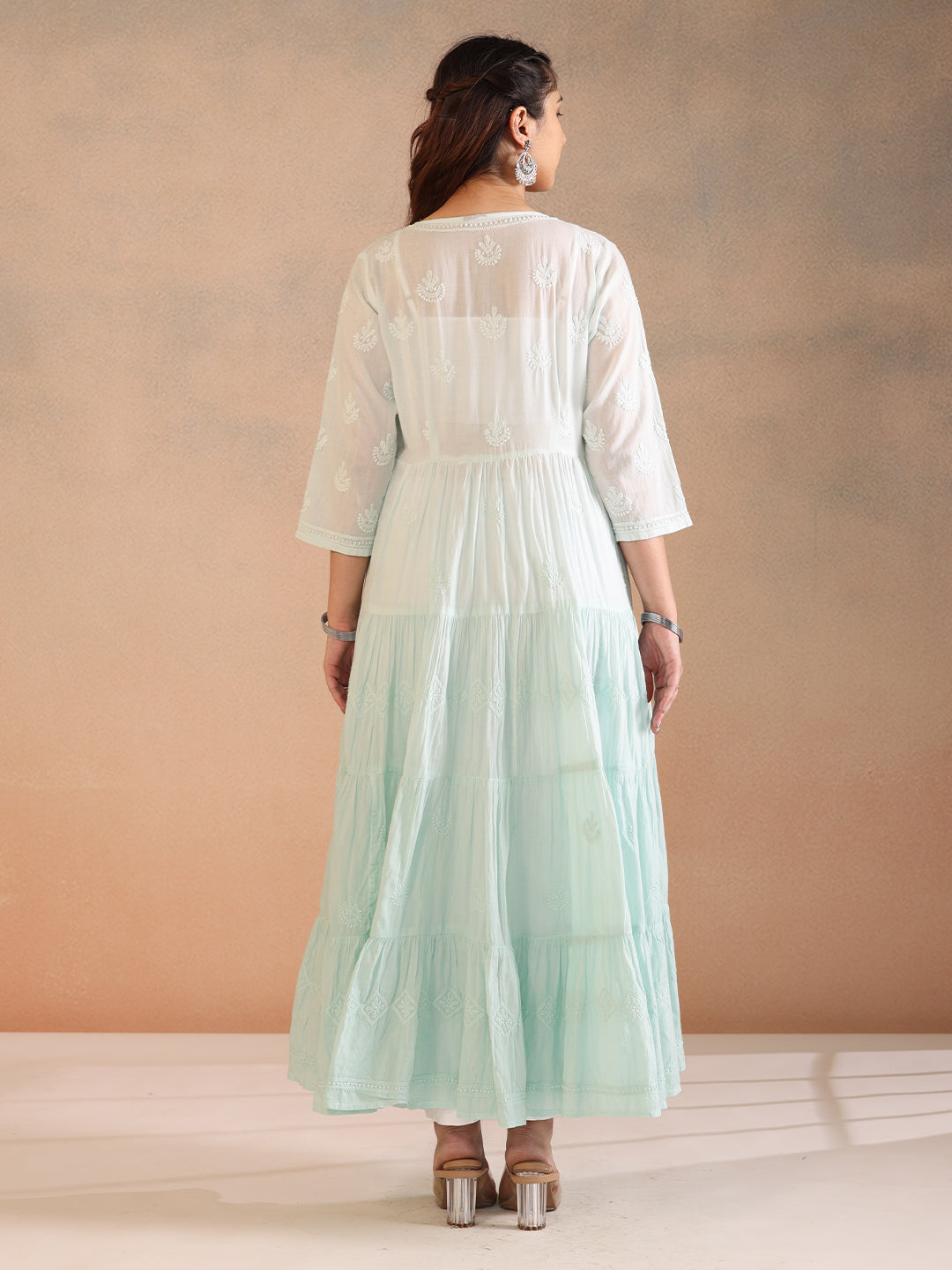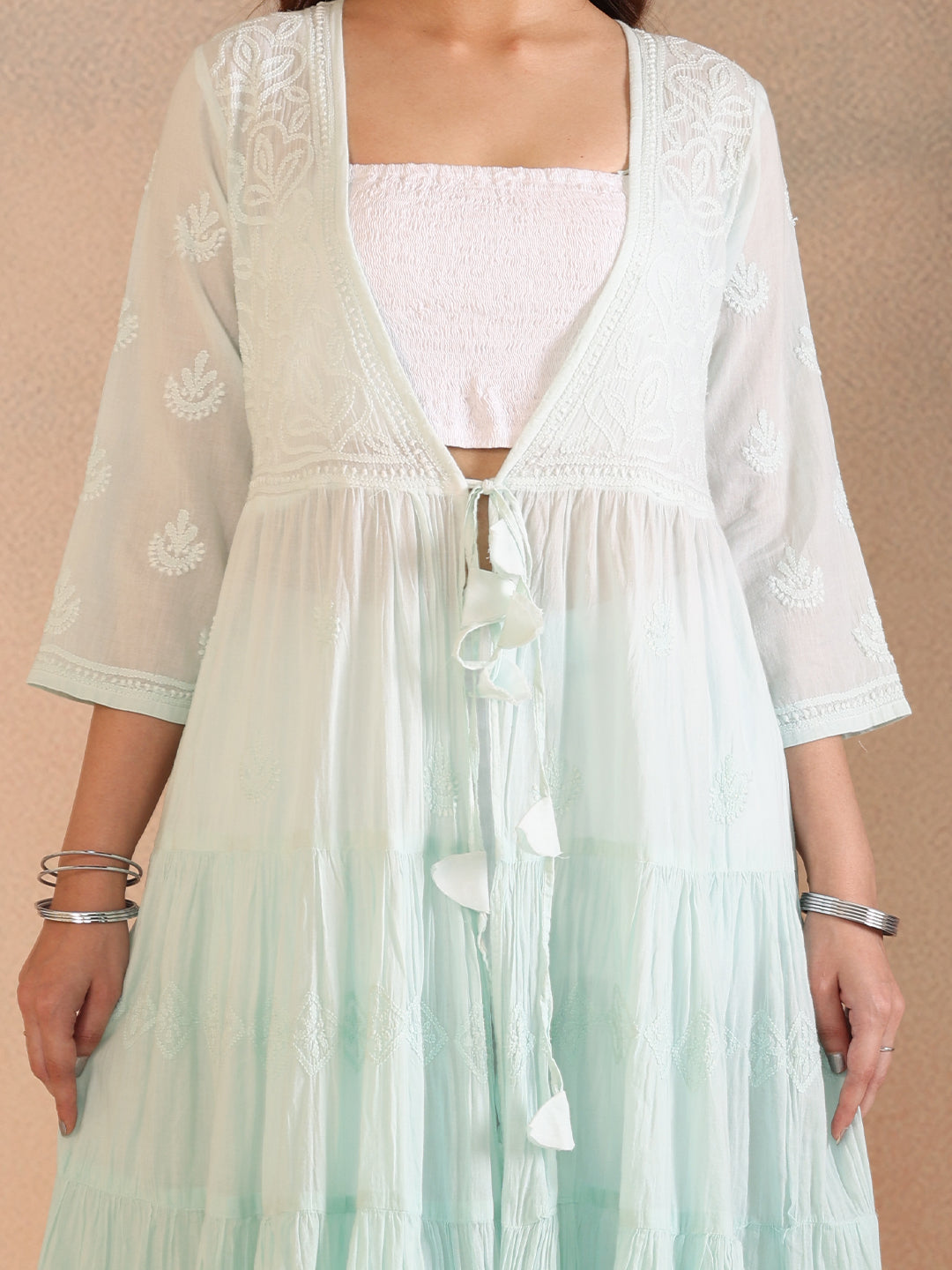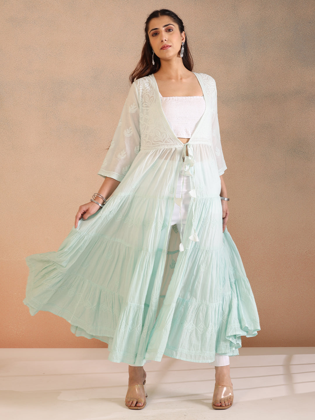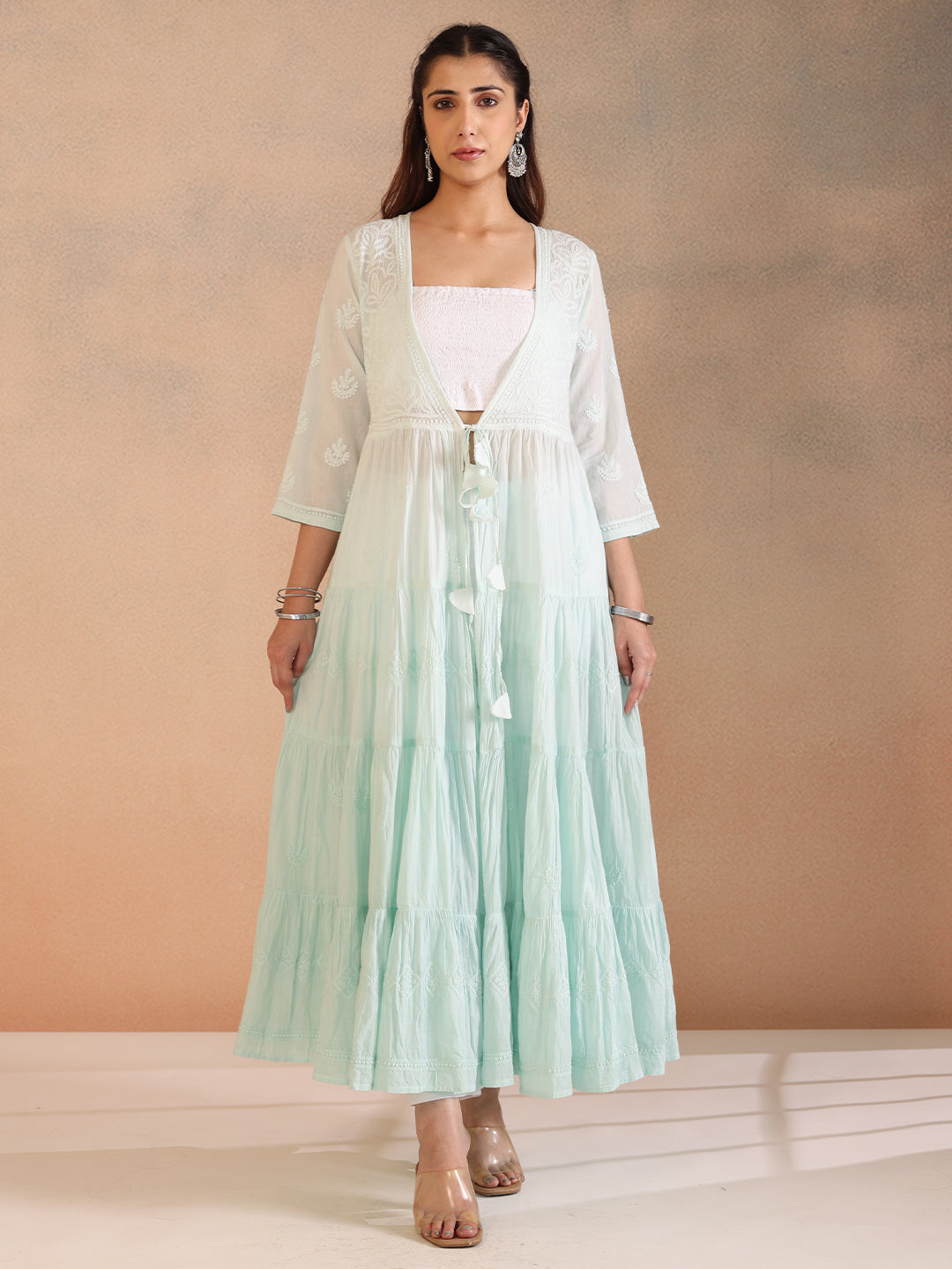 The SUHANA Mulmul Shrug is lightness in motion — airy, fluid, and quietly enchanting. Crafted in soft mulmul and dyed in a gentle ombré of green, it drapes effortlessly over the body, creating movement with every step. Delicate hand embroidery scattered across the surface adds texture without weight, making it a beautiful layering piece that elevates even the simplest base. Designed to be worn open or lightly tied, it brings softness, flow, and an easy sense of grace to any look.